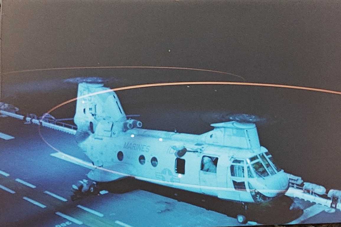 April 1992, USS Inchon (LPH-12). CH-46, Sea Knight, during NightOps. |