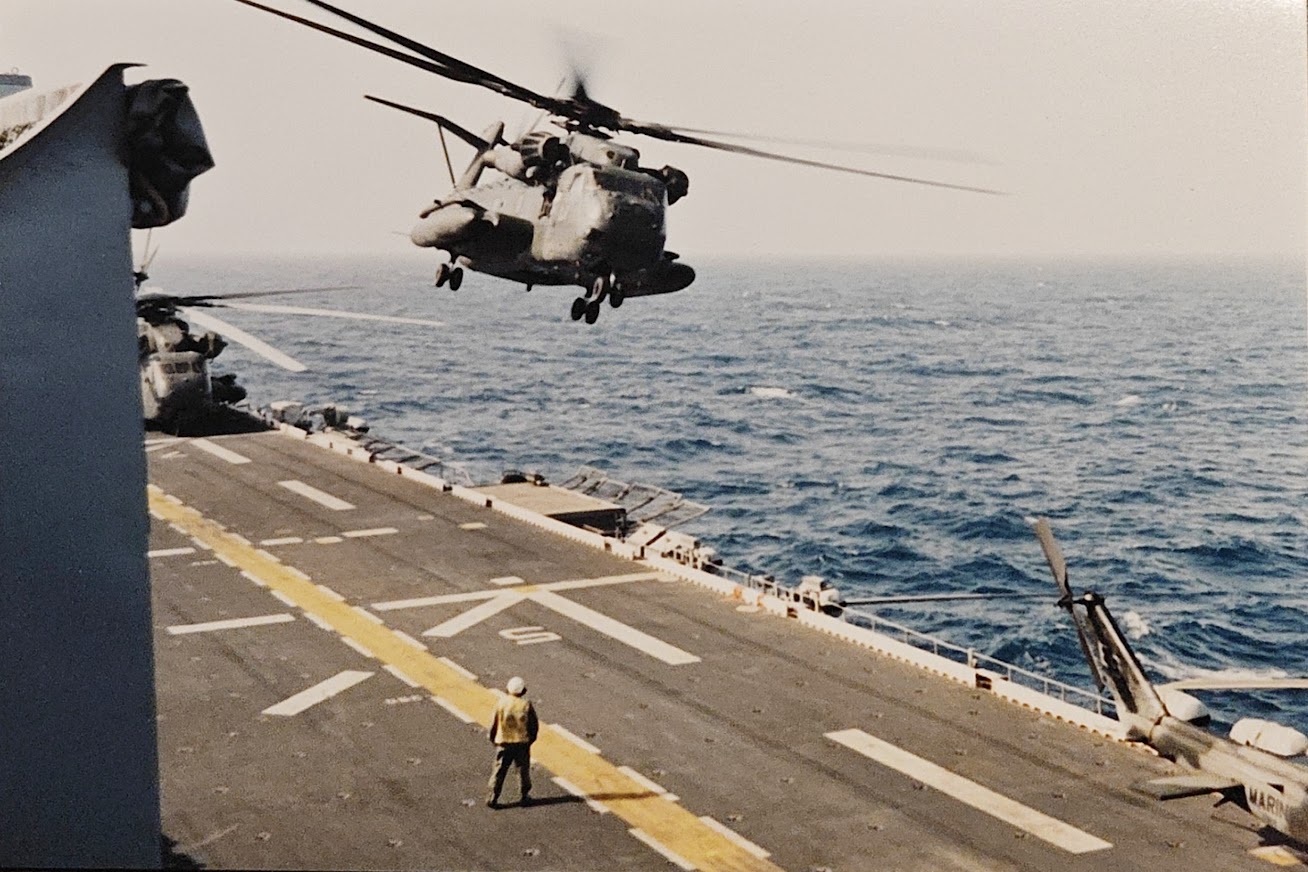 April 1992, USS Inchon (LPH-12). CH-53, Sea Stallion, taking-off. |